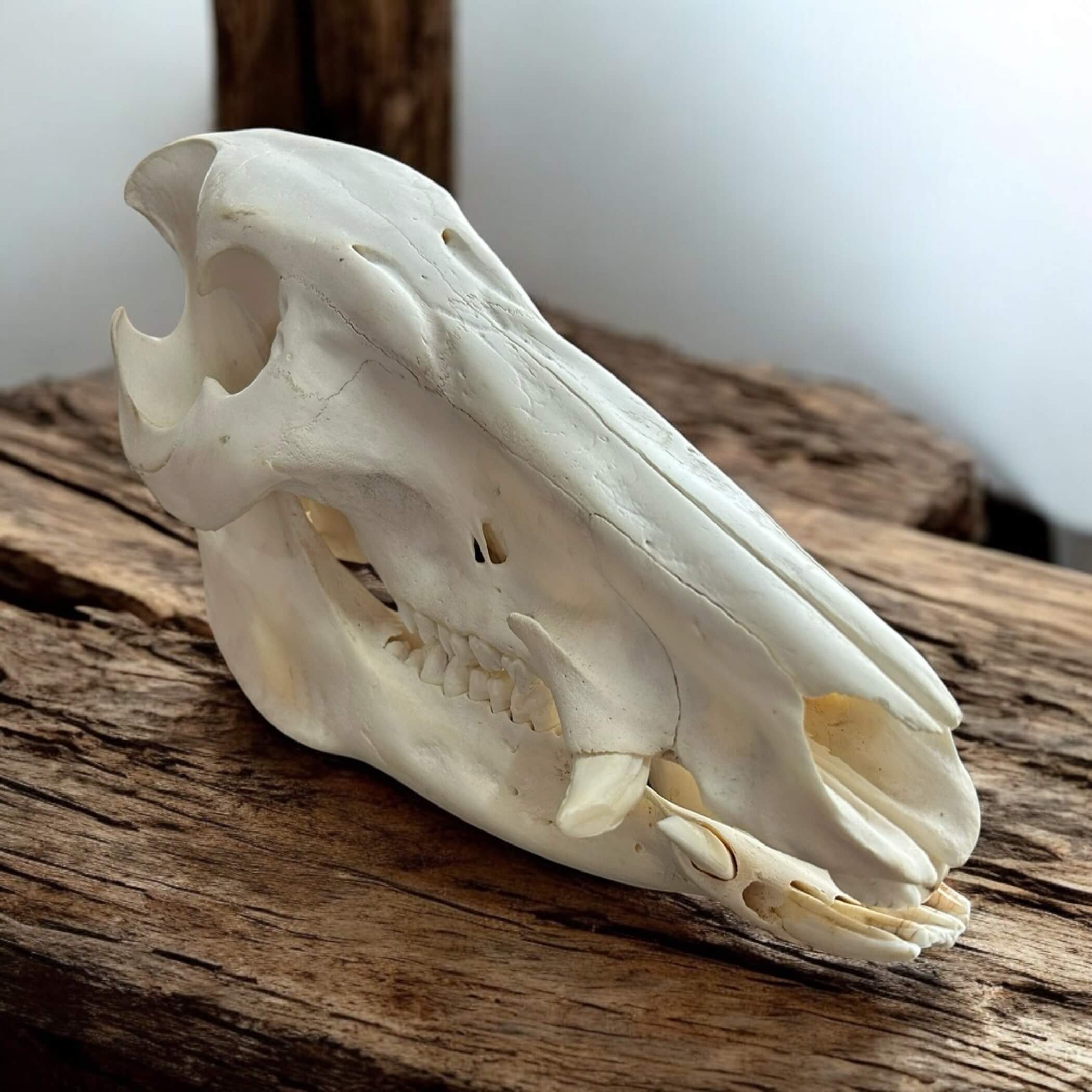 This authentic Bushpig skull adds raw African beauty to any décor. Carefully bleached and ethically sourced. Tag No: 1387. Size: 350x160mm.