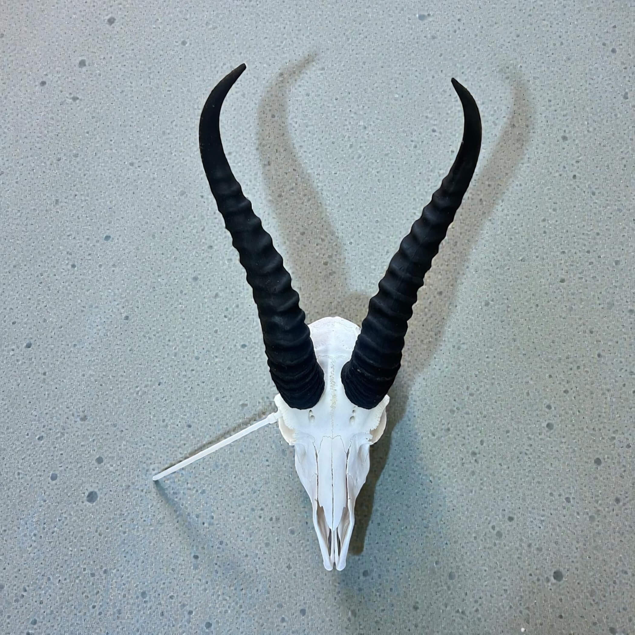 Authentic springbok skull, professionally cleaned and prepared for décor or display. Tag No: 842. Size: 380x200mm. Ideal for rustic interiors or African-inspired styling.